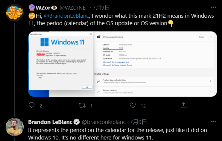 IT之家了解到,微软项目经理 Brandon LeBlanc 已经确认,Win11 的版本号将延续 Win10的规则,继续定名为 21H2。