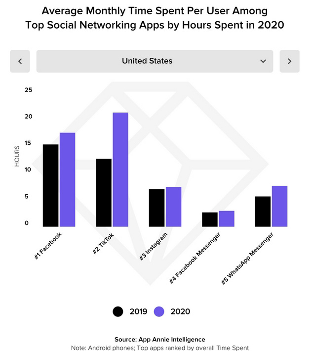 此外,TikTok 用户平均每月逗留时间也在去年继续增长,超过了 19.6 个小时(App Annie 统计数据),更是超过了 Facebook(16.6 个小时)。竞争对手不但没有崩溃,反而还在加速增长,甚至部分超越了自己,这无疑给扎克伯格带来了更大的刺激。