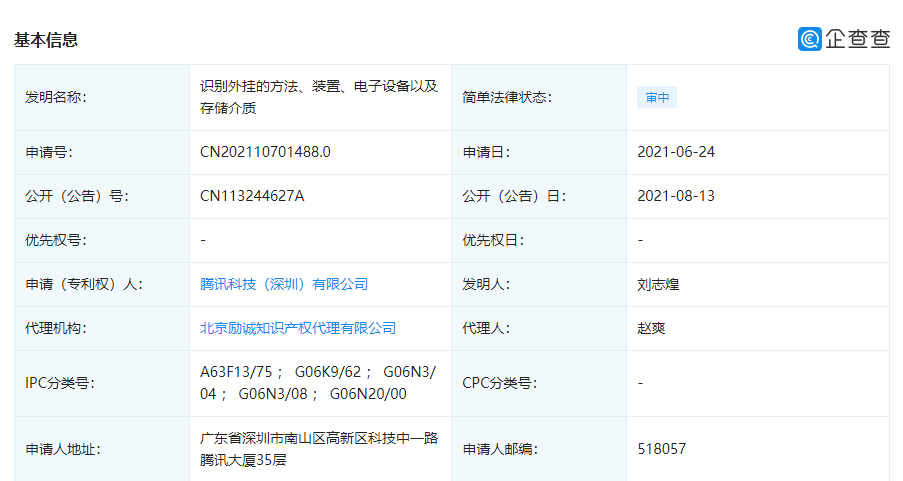 腾讯科技(深圳)有限公司在近日公开了一项“识别外挂的方法、装置、电子设备以及存储介质”专利,公开号 CN113244627A,专利申请日期为 2021 年 6 月。
