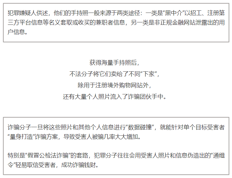 日前,浙江省温州市瓯海警方,就从一起大学生手持身份证照片泄露案入手,先手辗转福建、浙江、湖南、山东、河南等省市,抓获 11 名犯罪嫌疑人,截获手持照 110 余万条,摧毁了一条网络非法买卖个人手持证件照的黑色产业链。