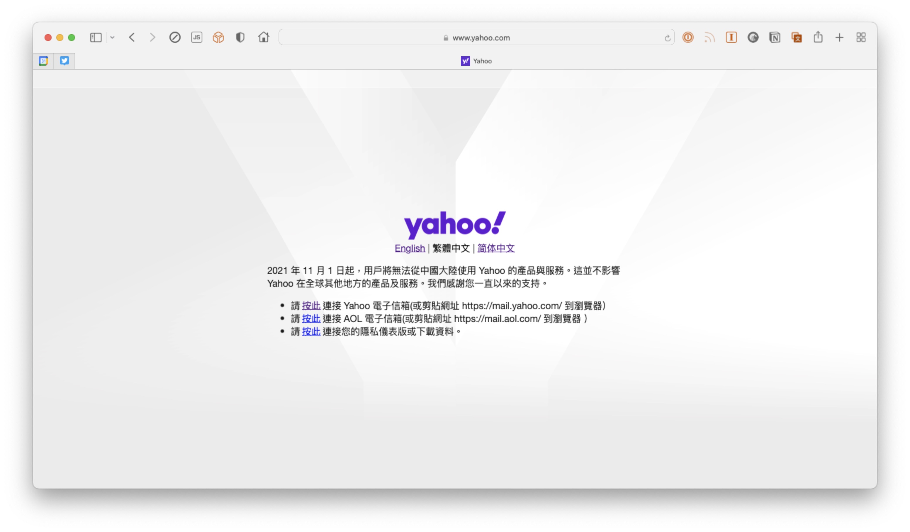 Yahoo(雅虎)宣布 2021 年 11 月 1 日起,用户无法从中国大陆地区使用 Yahoo 产品与服务,但不影响 Yahoo 在全球其他地方的产品及服务。与此同时,Yahoo 旗下科技媒体 Engadget 也关停了简体中文的“Engadget 中国版”。