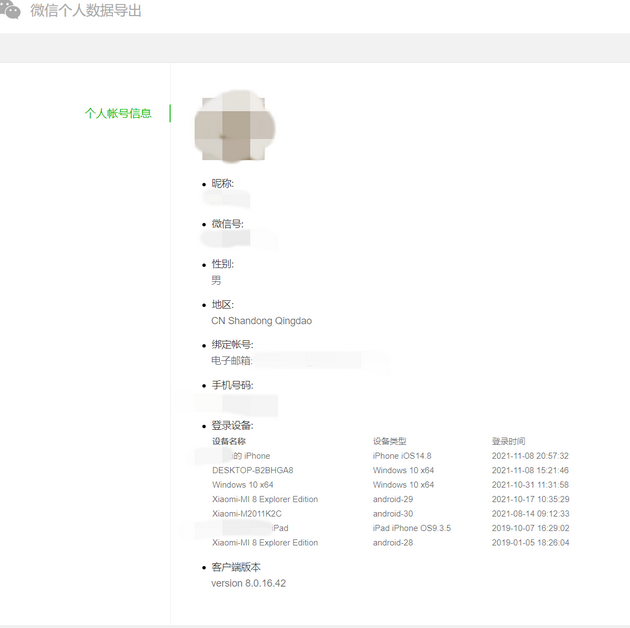 而国内版微信支持导出的是个人信息,包括头像、名字、微信号、性别、地区、个性签名、手机号、QQ号、邮箱地址、我的地址、登录过的设备、微信版本等信息。
