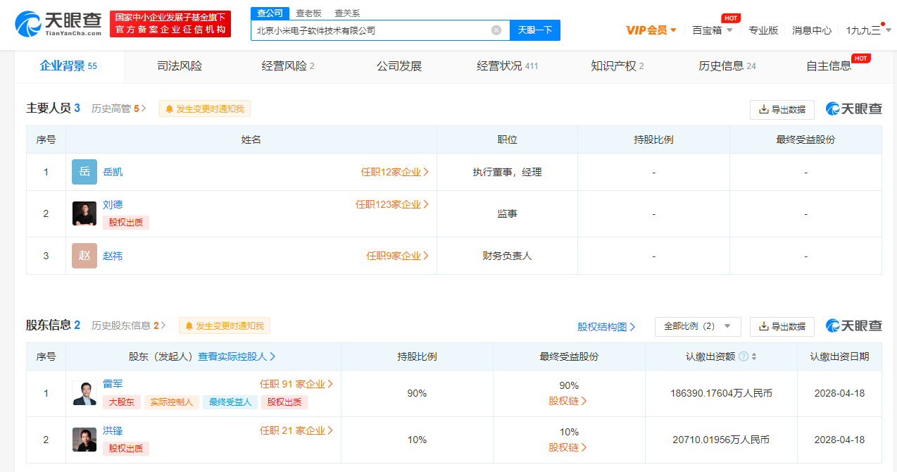 9月14日消息,据天眼查App显示,近日,天星数科关联公司北京小米电子软件技术有限公司发生工商变更,雷军卸任董事长,林斌卸任董事,洪锋卸任法定代表人、董事、经理,新增岳凯为法定代表人、执行董事、经理。