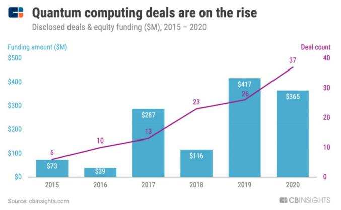 根据CB Insights的数据显示,2020 年量子计算初创公司的股权交易创下了37轮的新纪录,年增长率达到了近 42%。