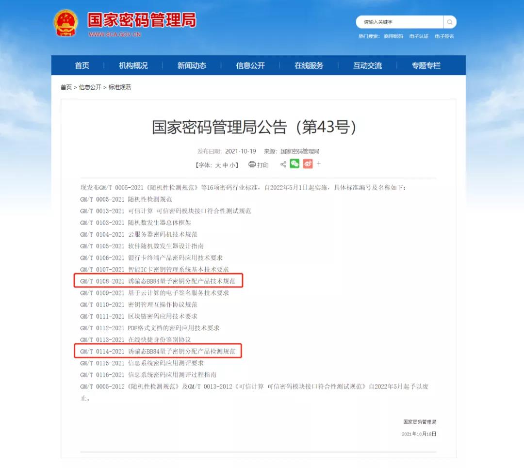 10月18日,国家密码管理局发布了《随机性检测规范》等16项密码行业标准,其中包括《GM/T 0108-2021诱骗态BB84量子密钥分配产品技术规范》和《GM/T 0114-2021诱骗态BB84量子密钥分配产品检测规范》。亨通问天量子参与国家首批量子密码行业标准的制订工作。