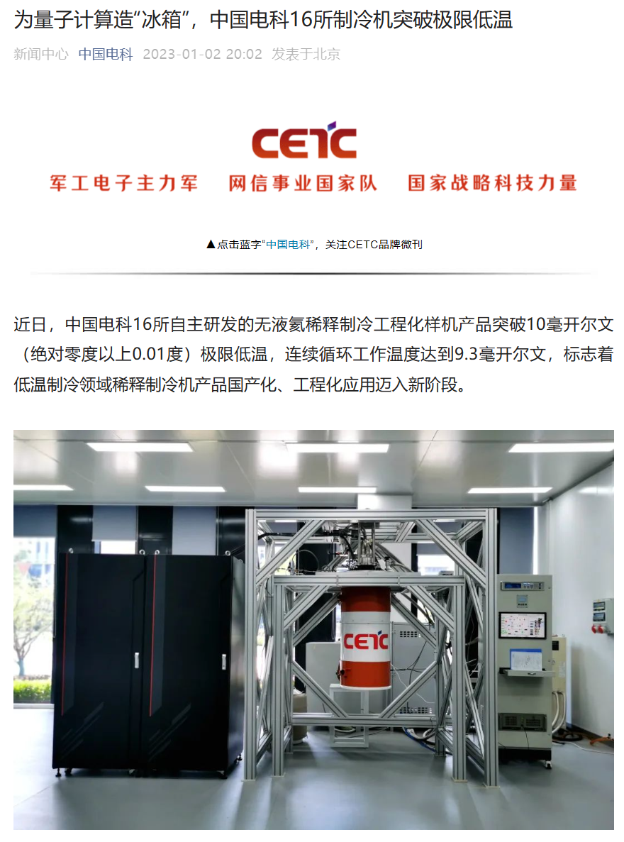 据中国电科官方消息,近日,中国电科 16 所(合肥低温电子研究所)自主研发的无液氦稀释制冷工程化样机产品突破10 毫开尔文(绝对零度以上 0.01 度)极限低温,连续循环工作温度达到 9.3 毫开尔文,标志着低温制冷领域稀释制冷机产品国产化、工程化应用迈入新阶段。