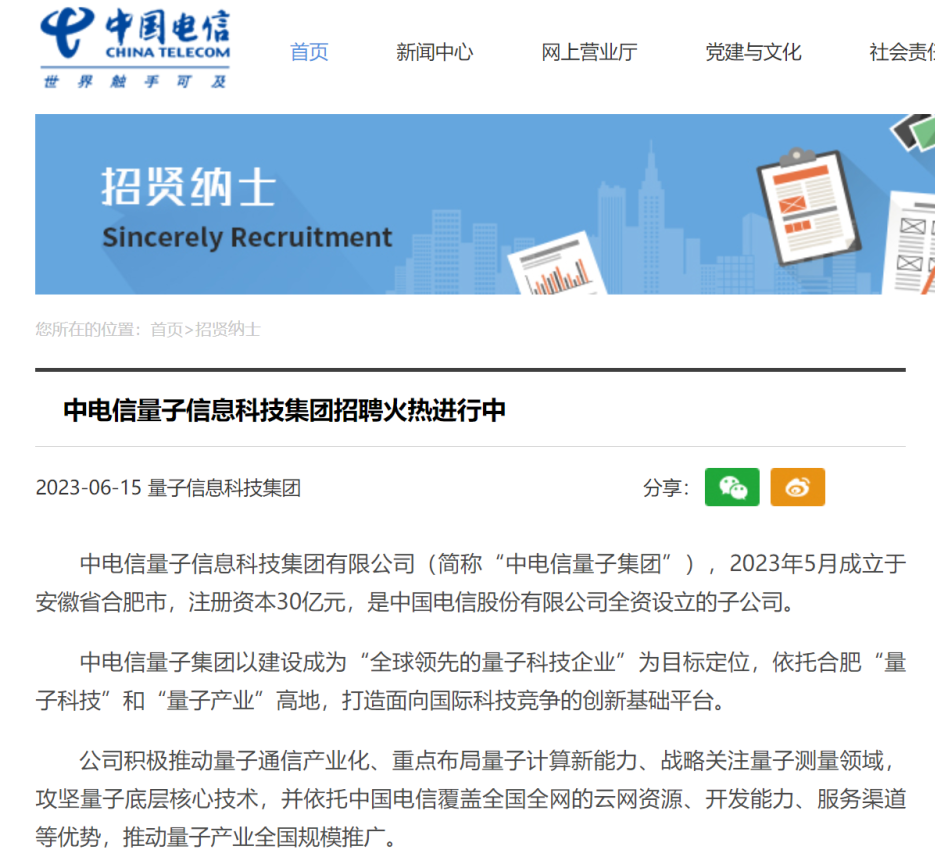 中电信量子集团虽刚成立不久,但由实力雄厚的中国电信全资设立,注册资金达30亿,是当前全球注册资本最高的量子科技企业。其地理位置坐落于量子圈“网红”城市合肥,发展前景广阔。集团目前人才短缺,此次招贤纳士,更是为广大专业人才提供了一个难得的机会。