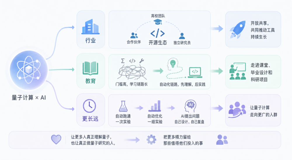从教育角度看,混合编程一直是量子课堂上的拦路虎。学生既要懂数学和算法,又要熟悉编程和操作,门槛抬得很高。把这条链路自动化以后,学习者可以先把注意力放在“为什么要这么做”,再回头看“具体怎么做”,理解曲线被拉平很多。我们也希望这套工具能走进更多课堂、毕业设计和科研项目,让初学者更快上手,让资深研究员把时间留给真正难的问题。