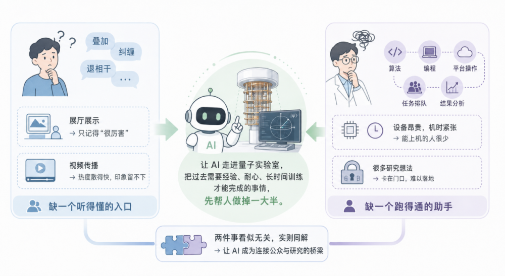 公众这边缺一个听得懂的入口,研究这边缺一个跑得通的助手。两件事看着无关,其实指向同一种解法——让AI走进量子实验室,把过去需要经验、耐心、长时间训练才能完成的事情,先帮人做掉一大半。