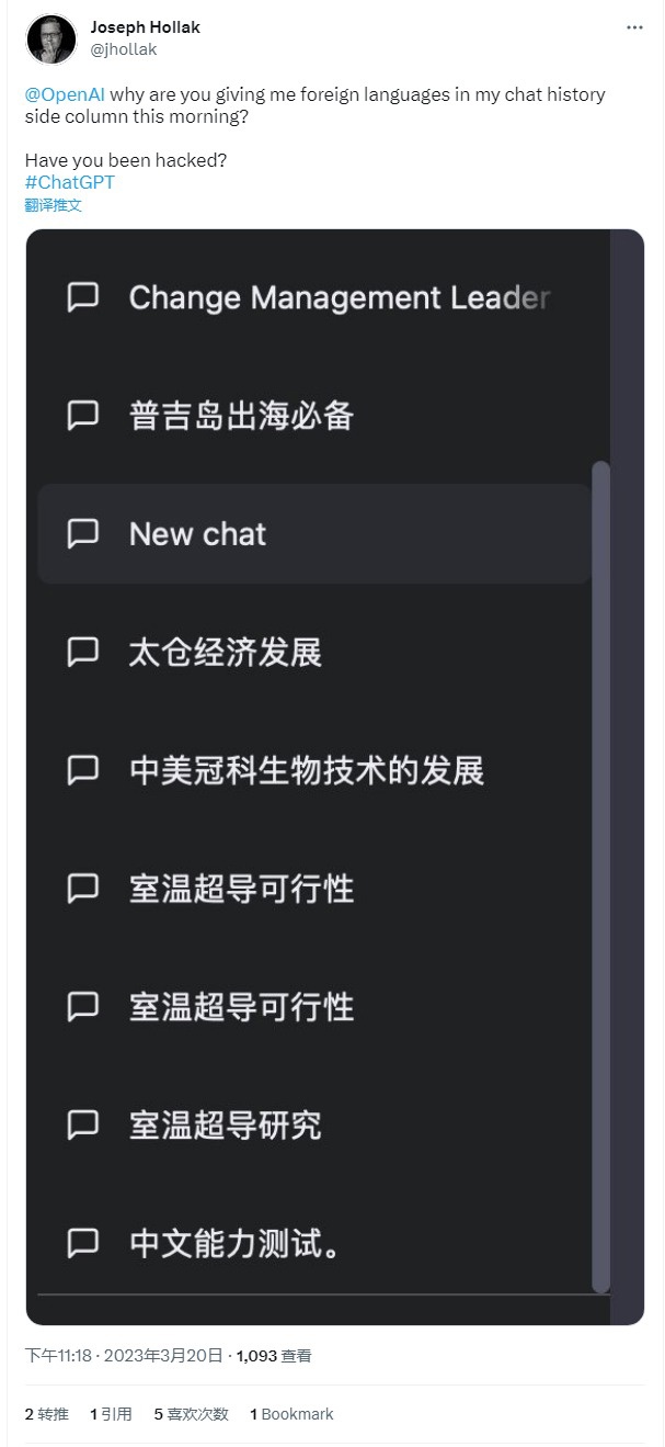 本次事件自本周一开始,用户反馈在聊天记录中显示了来自于他人的 ChatGPT 聊天对话。IT之家翻译阿尔特曼的推文内容如下:“小部分用户可以看到其他用户聊天的相关标题”,但他并未就此事展开说明。