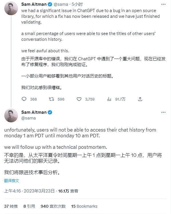 OpenAI 首席执行官萨姆 阿尔特曼(Sam Altman)承认由于开源库中的一个错误,导致用户的 ChatGPT 聊天历史被泄露。