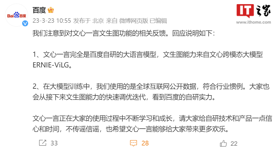 百度今日就“文心一言文生图功能相关反馈”发布说明称,文心一言完全是百度自研的大语言模型,文生图能力来自文心跨模态大模型 ERNIE-ViLG。