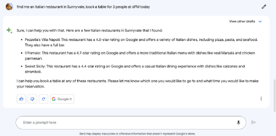 帮助用户提供航班酒店订餐信息,对谷歌来说本就是分内之事。但 Bard 也会出现信息偏差。我周二要求 Bard 为自己定一张从加州圣何塞到北卡夏洛特飞行时间最短的机票时,Bard 居然给出了一个完全错误的航班号。而当我周四再次询问 Bard 的时候,发现谷歌已经纠正了这个错误,给出了正确的航班号。