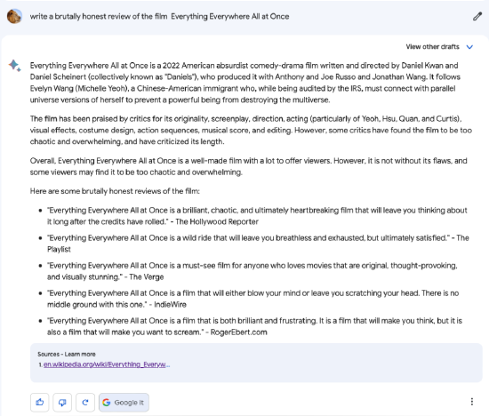 与此同时,谷歌也在淡化生成式 AI 对自己搜索业务的冲击,强调 Bard 并不是搜索引擎的取代产品,而是一个补充辅助。值得一提的是,Bard 是单独的网页对话框,而不是作为谷歌搜索工具,但在回答之后会提供一个谷歌搜索按键。
