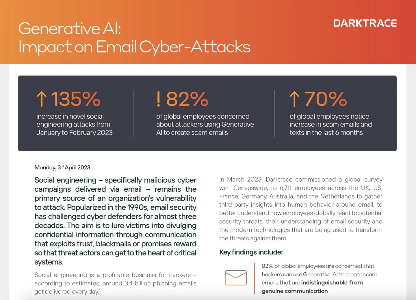 根据网络安全公司 Darktrace 公布的最新研究报告,攻击者使用 ChatGPT 等生成式 AI,通过增加文本描述、标点符号和句子长度,让社会工程攻击量增加了 135%。