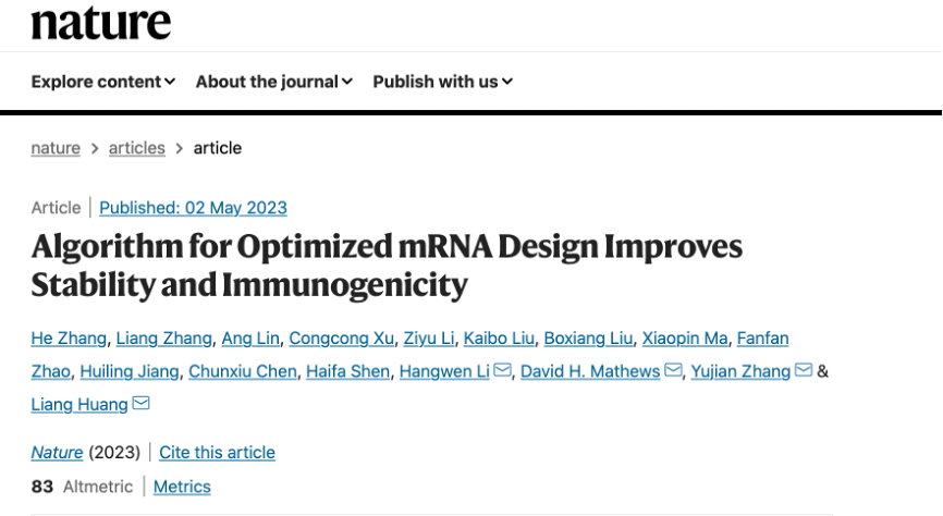 这是中国科技企业首次以第一完成单位的身份在《Nature》杂志发表论文。鉴于论文对生物医学领域的重要性,Nature杂志在正式排版之前先将预览版快车道上线 (accelerated article preview),这也是AI应用于mRNA领域的首篇CNS主刊论文。