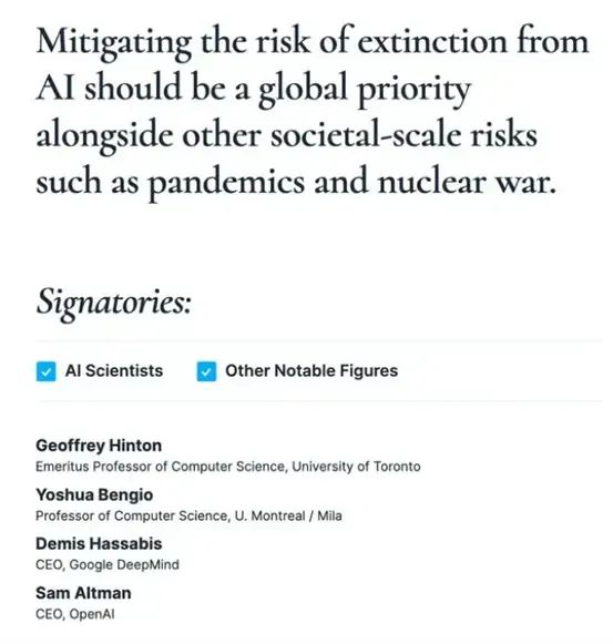 基于外界对AI的种种担忧,日前,由“AI教父”杰弗里 辛顿、Anthropic的首席执行官达里奥 阿莫代,Google Deep Mind首席执行官戴米斯 哈萨比斯等超过350位AI领域高管和专家共同签署了“减轻AI带来的灭绝风险,应该与流行病和核战争等其他社会规模的风险一起,成为全球优先事项”的联合声明。