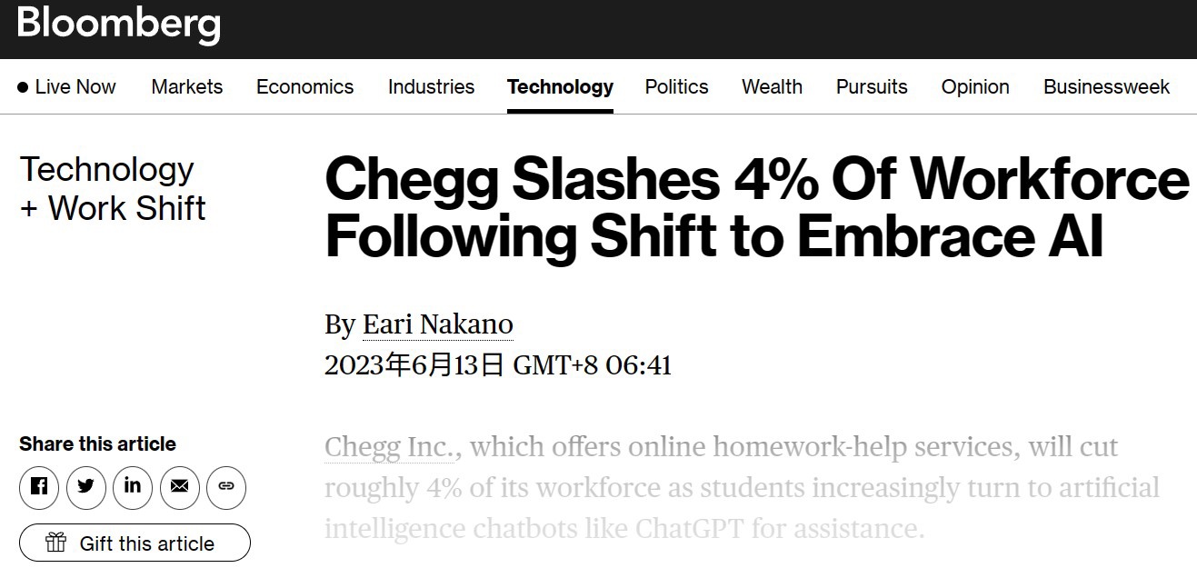 此前,Chegg 公司首席执行官 Dan Rosensweig 声称,OpenAI 的 ChatGPT 对他们的新客户增长率产生了影响,“ChatGPT 是一个致命打击,因为公司主要收入来源就是向学生提供作业解答服务”,之后 Chegg 的股价接近腰斩,暴跌了 40% 以上。