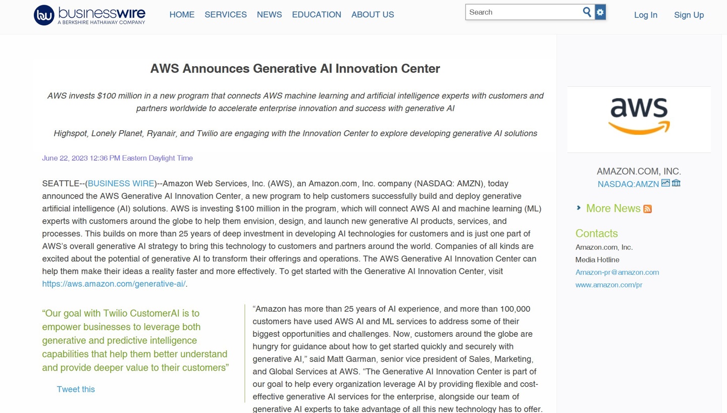 IT之家注意到,目前亚马逊旗下 AWS 生成式 AI 服务已经有许多参与者,例如 AI 销售工具商 Highspot、旅游公司 Lonely Planet、Ryanair 航空及专案管理平台 Twilio 等。亚马逊当下此举有望进一步扩充 AWS 相对于竞品的影响力。