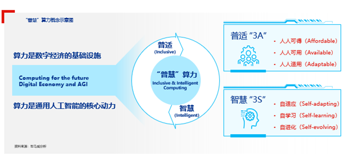 “普慧”算力强调立足实际使用需求,安全合理的使用数据,以高效的算法,实现可靠的数字化、智能化效果。其中,“普”为“普适”,强调以自然交互的方式提供算力,算力将成为人人可得、人人可用、人人适用的“3A”型基础资源,旨在让人们即取即用算力而不必见;“慧”为“智慧”,强调以认知驱动的方式提供算力,算力将具备自适应、自学习、自进化为代表的“3S”智能,能够让人们随需使用算力而不必问。