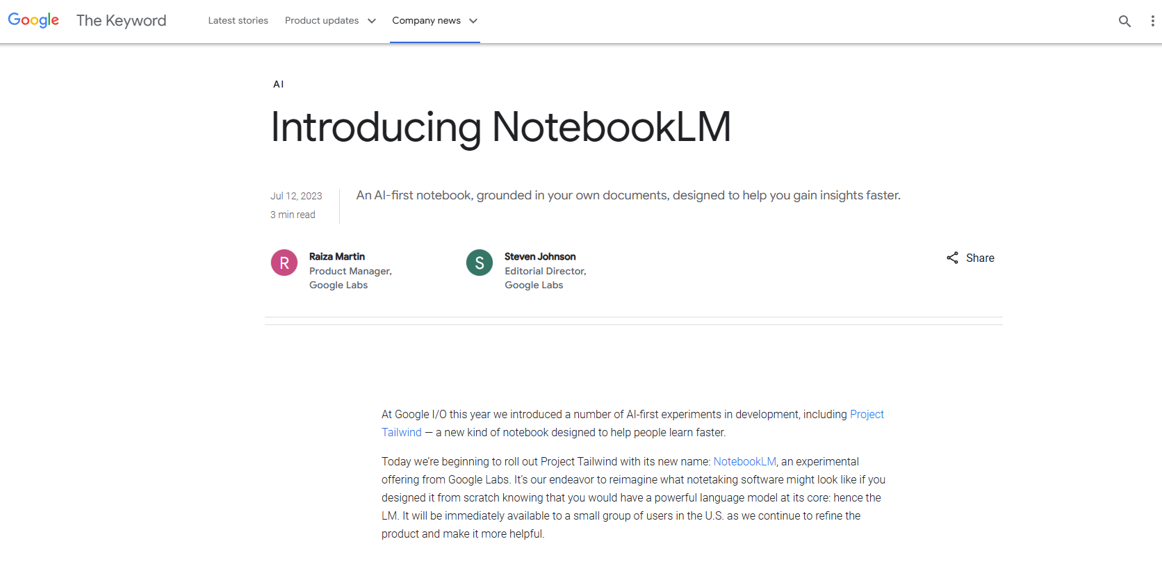 在今年 5 月的谷歌 I / O 2023 大会上,谷歌推出了自家首款“AI 笔记应用”,在当时名为“Project Tailwind”。日前,这款实验性笔记应用已被更名为 Notebook LM,并开放小范围测试。