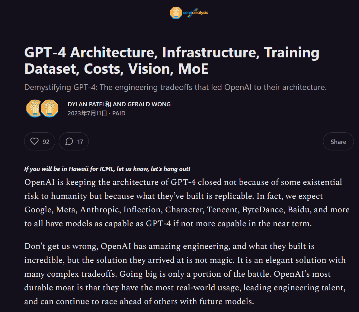 外媒 Semianalysis 近日对 OpenAI 今年 3 月发布的 GPT-4 大模型进行了揭秘,其中包括 GPT-4 模型架构、训练和推理的基础设施、参数量、训练数据集、token 数、成本、混合专家模型(Mixture of Experts)等具体的参数和信息。