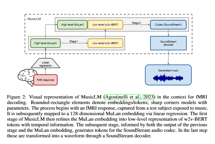 Brain2Music 基于谷歌此前推出的 MusicLM 模型(基于文本生成音乐片段),基于 fMRI 生成 15 秒音乐片段。