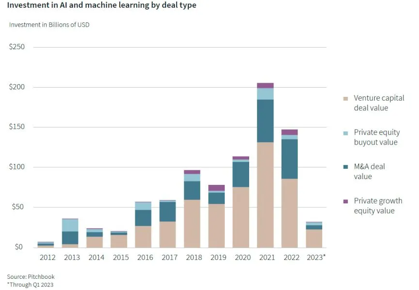 截至 2023 年第一季度,按交易类型划分的人工智能和机器学习投资。图表由 Pitchbook 提供,由仲量联行提供