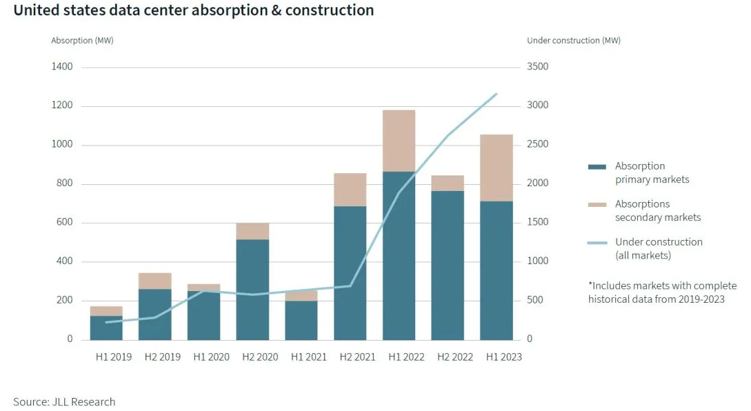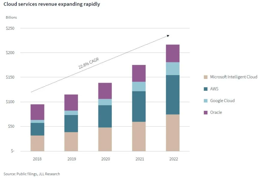 主要的云服务提供商正在迅速扩张,以支持不断增长的需求。仲量联行指出,从2018年到2022年,微软智能云、AWS、谷歌云和甲骨文的复合年增长率总计为22.8%。超大规模企业、金融公司、医疗保健公司和其他大型企业都在争夺数据中心空间,导致2023年上半年的数据中心吸收量创历史新高。这种加速增长的需求很大程度上来自于越来越多的公司和行业将人工智能作为实现企业目标的重要工具。