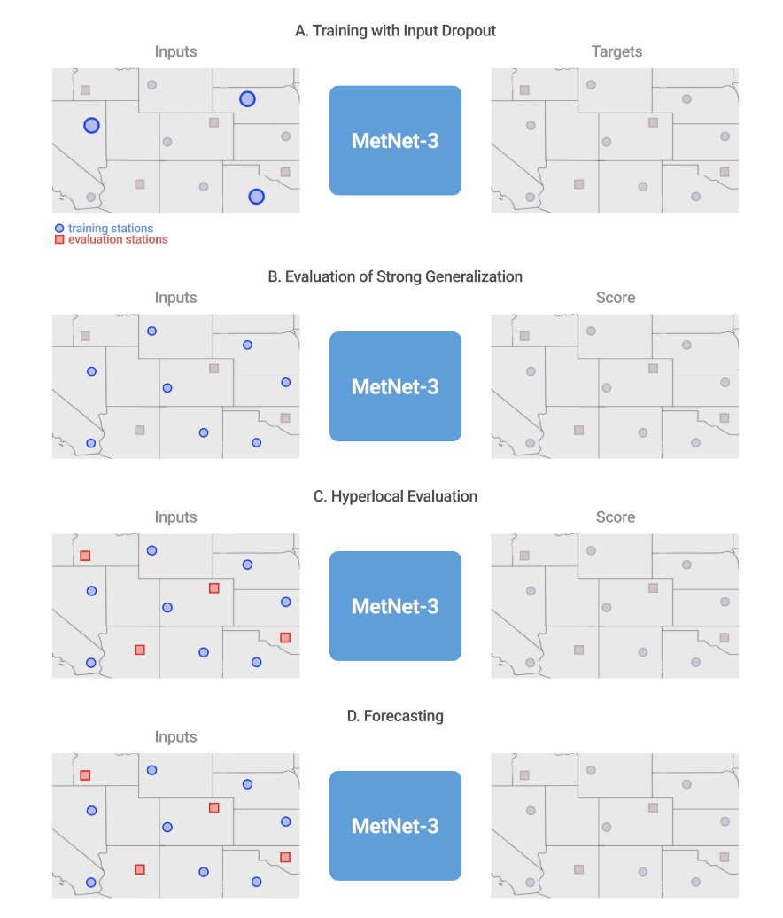 MetNet-3 在预测天气上,与其他建立在传统方法之上的机器学习方法不同,关键点在于 MetNet-3 直接通过大气观测资料进行训练和评估。研究人员提到,直接观测的优点在于数据密度及解析度更高。此外,除了继承先前 MetNet 模型的数据之外,MetNet-3 还新增学习来自气象站的气温、风力测量资料,以尝试对所有位置进行全方位天气预测。