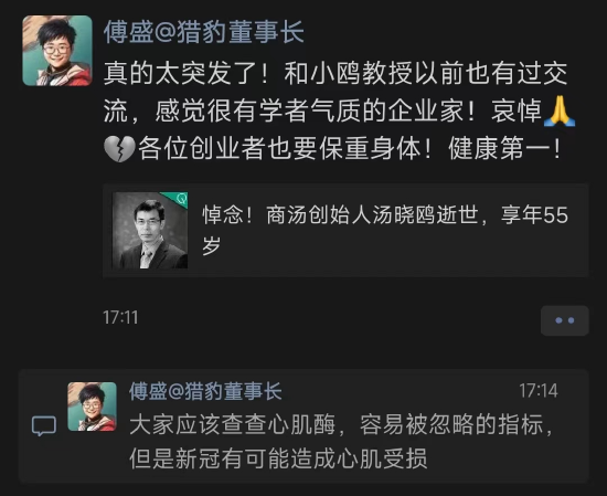 公司讣告发布后,猎豹移动董事长兼CEO、猎户星空董事长傅盛于朋友圈悼念表示:“真的太突发了!和小鸥教授以前也有过交流,感觉很有学者气质的企业家!哀悼。各位创业者也要保重身体!健康第一!”