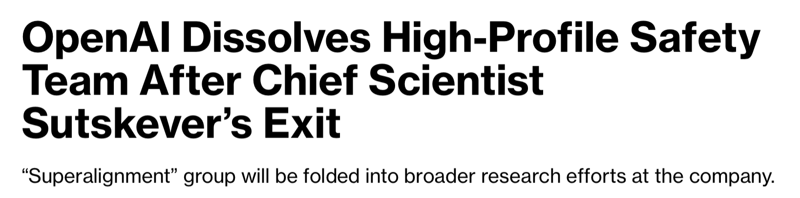 经查询得知,OpenAI 在 2023 年 7 月设立 Superalignment 团队,任务是“确保那些具备‘超级智能’、‘比人类还聪明’的 AI 系统能够遵循人类的意图”。当时 OpenAI 承诺在未来的 4 年内投入 20% 的计算能力来保证 AI 模型的安全性,而根据彭博社报道,OpenAI 目前据称已经解散了 Superalignment 团队。