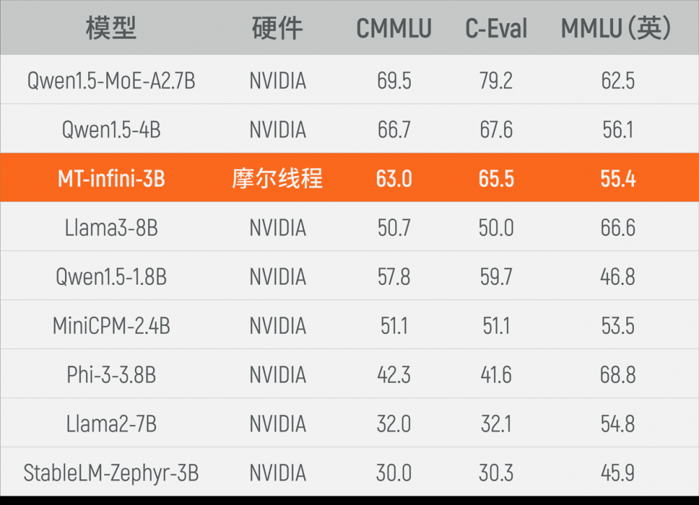 MT-infini-3B模型训练总用时13.2天,经过精度调试,实现全程稳定训练不中断,集群训练稳定性达到100%,千卡训练和单机相比扩展效率超过90%。目前,实训出来的MT-infini-3B性能在同规模模型中跻身前列,相比在国际主流硬件上训练而成的其他模型,在C-Eval,MMLU,CMMLU等3个测试集上均实现性能领先。