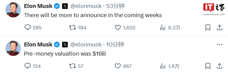 xAI 表示,这笔资金将用于把 xAI 的首批产品推向市场、建设先进的基础设施并加速未来技术的研发。“未来几周将会有更多消息公布,xAI 的投前估值为 180 亿美元”马斯克在 X 上的一篇帖子中回应融资公告时表示。