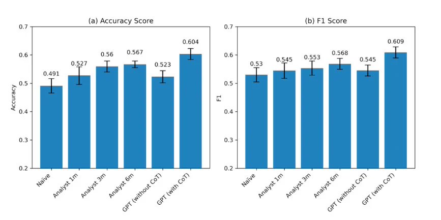 据IT之家了解,研究人员向模型提供了匿名化的财务数据,包括资产负债表和损益表,并要求其预测未来盈利增长情况。即使没有任何额外的信息,GPT-4 也能够实现 60% 的准确率,而人类分析师的典型准确率区间仅为 53% 到 57%。