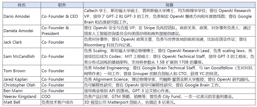 经验丰富的团队:Anthropic的创始团队成员具有深厚学术和技术背景,他们大多为OpenAI的前核心员工,曾深度参与过 OpenAI的GPT-3、引入人类偏好的强化学习等多项研究。