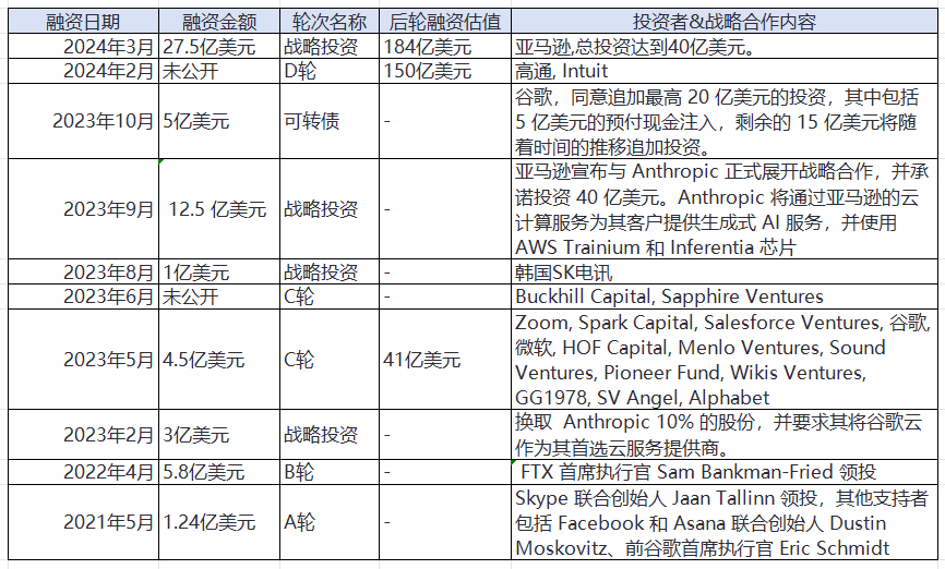 Anthropic目前拥有近60家投资者,包括亚马逊、谷歌、Salesforce、SAP和Zoom等战略投资者。Anthropic最新融资估值达184亿美元,历史融资合计超75亿美元。