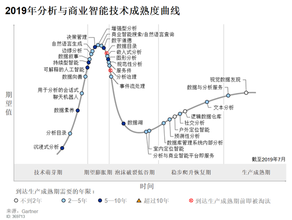 图一、Gartner 2019年分析与商业智能技术成熟度曲线