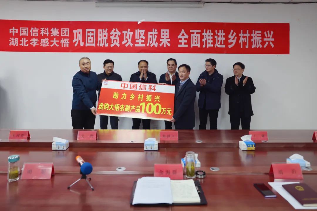 座谈会后,举行了中国信科集团助力大悟县乡村振兴捐赠仪式,中国信科将选购大悟县农副产品100万元,并向大悟县河口镇金墩村无偿捐赠80万元,进一步助力大悟县乡村振兴工作。