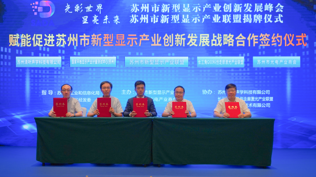 会上,苏州市新型显示产业联盟与国家平板显示产业计量测试中心(苏州)、长三角G60科创走廊激光产业联盟、苏州市光电产业商会、苏州清听声学科技有限公司,进行了赋能促进苏州市新型显示产业创新发展的战略合作签约,将在党建共促、平台共建、资源共享、活动共办、阵地共用、事务共商等方面深化交流、形成合力,进一步推动苏州显示产业创新升级与高质量发展。