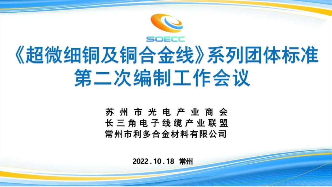 10月18日,《超微细铜及铜合金线》系列团体标准第二次编制工作会议顺利召开,主会场设在常州市利多合金材料有限公司。由苏州市光电产业商会主办,长三角电子线缆产业联盟、常州市利多合金材料有限公司承办。