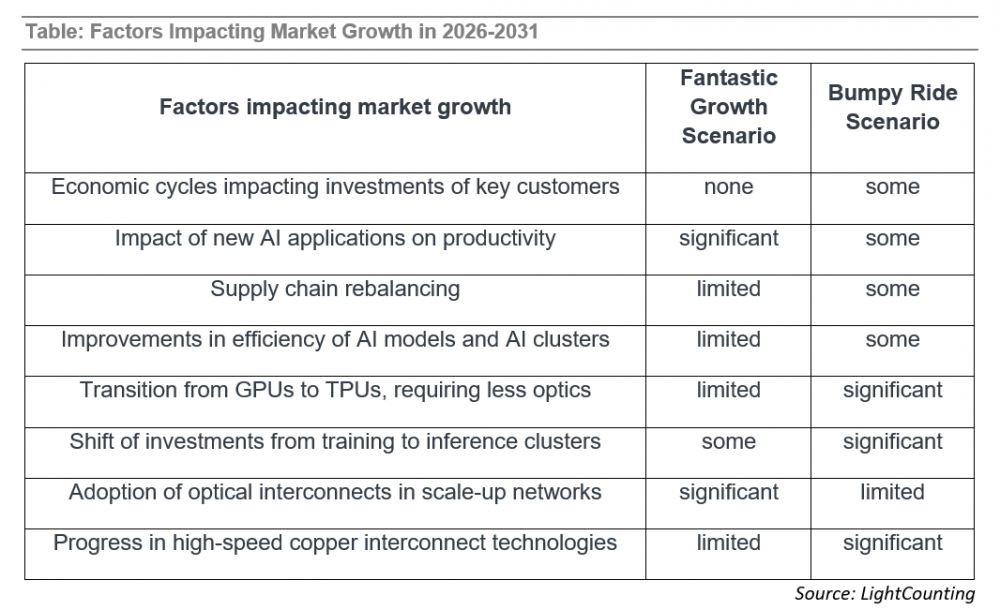 对于2027年-2031年的市场增长,存在更多不确定性。如图所示,“高速增长”(Fantastic Growth)可能会在2027年及以后持续。然而,2004年-2025年光模块销售的历史数据显示出一种周期性模式:2-3年的增长期之后会出现一个持平或负增长的年份。