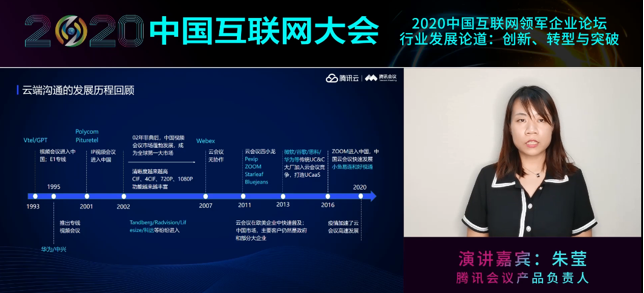 腾讯会议产品负责人朱莹以“云端沟通,协作无间”为主题发表演讲。她指出,新基建的背景下,衍生了云毕业、云答辩、云签约、云授课、云发布会等云端沟通新场景。随着跨部门、跨企业、跨地域的大规模远程协作需求,对于云端沟通的平台、架构、安全和应用性也提出更高要求。她提到,腾讯会议希望做一个桥梁,将视频会议厂商云会议平台,SaaS协同平台与微信、QQ、企业微信千千万万个用户连接起来,来提升整个平台的价值。