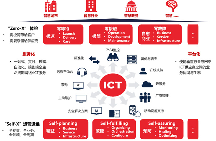 自智网络旨在通过完全自动化的网络和ICT基础设施、敏捷运营和全场景服务,为垂直行业和消费者用户提供Zero-X(零等待、零接触、零故障)的极致体验,利用前沿技术实现“将复杂留给供应商,将极简带给客户”;帮助运营商构建Self-X(自服务、自发放、自保障)的运营运维,助力规划建设、营销服务、运营运维等部门实现生产、经营和管理的自动化、智能化。