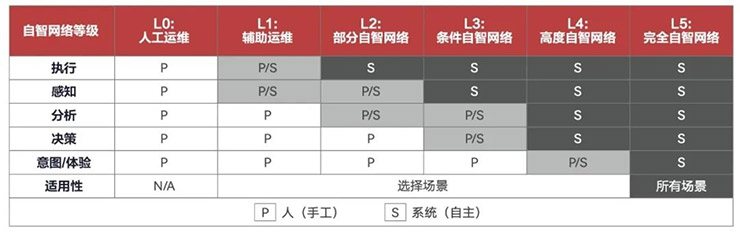 为了衡量网络自动化和客户业务体验的不同水平,自智网络定义了从L0到L5六个等级,评估和衡量自智网络服务的价值和优势,并指导网络和服务的自动化与智能化的逐步升级。