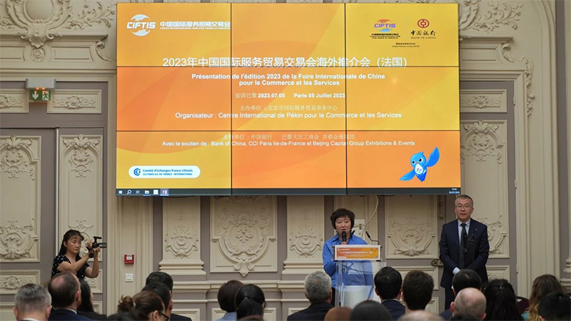 7月5日,2023年中国国际服务贸易交易会首场海外推介会在法国巴黎成功举办。北京市副市长司马红、中国驻法国大使馆公使沈翔、法中交流委员会秘书长苏小青、法国巴黎大区工商会会长何思诺、中国银行巴黎分行行长何立勤、北京市国际服务贸易事务中心主任赵旗舟等出席活动。本次推介会吸引了法中交流委员会、巴黎工商会、宝马集团、施耐德电气等60家法方商协会和企业参与。