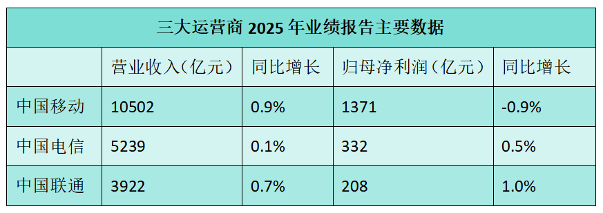 C114讯 3月30日消息(九九)截至3月26日晚,中国联通、中国电信、中国移动相继发布2025年业绩报告。从主要数据来看,三大运营商整体经营稳健,甚至有点过于“稳”了!