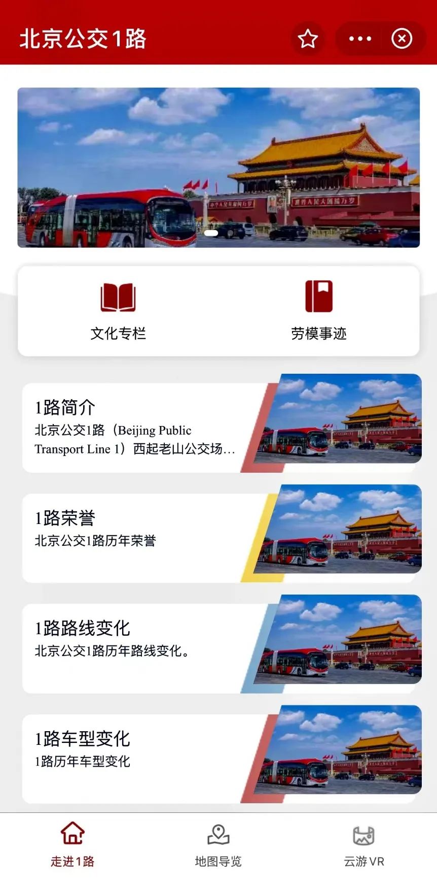 北京公交1路线路起于老山公交场站,穿越东西长安街,途经天安门、南礼士路、军事博物馆等标志性站点,止于四惠枢纽站。作为北京最具代表性、知名度最高、也是历史最悠久的公交线路。1路公交自1935年开通至今已87年,被群众们亲切地称为“大1路”。为了让“大1路”在数字时代焕发新颜,北京移动为1路公交量身定制了5G+VR沉浸式乘车信息化应用。乘客乘车时,可以在“云游1路”小程序上,一边观看精美的手绘风“导览地图”,一边聆听根据实时定位自动获取的语音讲解,了解沿途重要建筑和景点名胜。以数字化赋能百年公交,形成令人耳目一新的特色车厢文化,满足人民日益增长的美好出行需要。据悉,“云游1路”小程序已于近期正式上线,“大1路”也由此成为全国首条“公交+文旅”5G行业创新公交路线。