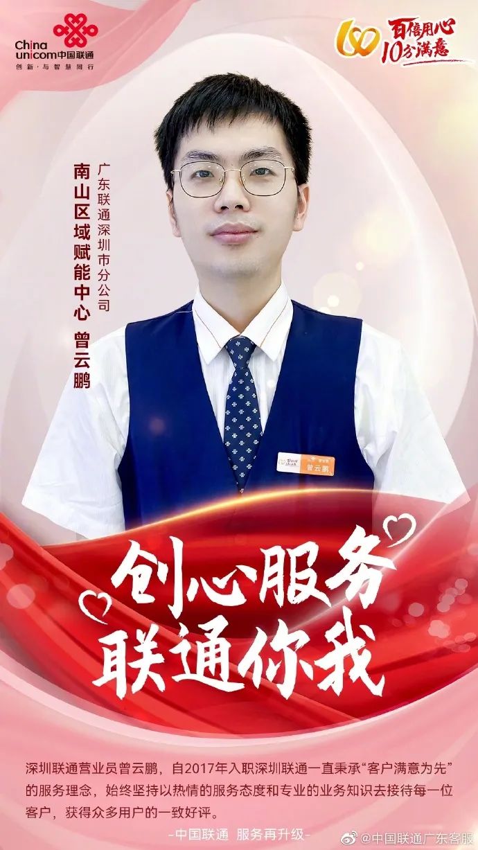 “我”是深圳联通的营业员曾云鹏,把困难留给自己,把满意带给客户即便是下班时间,也会第一时间主动为客户做上门服务。近日,用户陈先生进厅本打算详细了解政策内容,但因着急上班,欲言又止,为方便陈先生尽快开通使用业务,与用户约定利用下班时间上门服务。19:30,如约而至,按客户要求成功为其办理了入网手续,贴心周到的服务让陈先生由衷赞许。