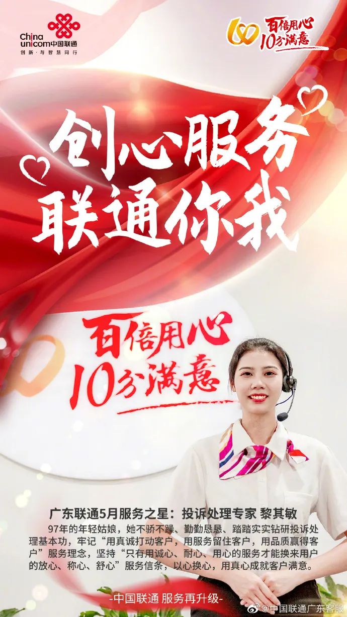 “我”是广东联通投诉处理专员黎其敏,身为一名97年的年轻姑娘,勤勤恳恳、踏踏实实钻研投诉处理基本功,牢记“用真诚打动客户,用服务留住客户,用品质赢得客户”服务理念,坚持“只有用诚心、耐心、用心的服务,才能换来用户的放心、称心、舒心”服务信条,以心换心,用真心成就客户满意。